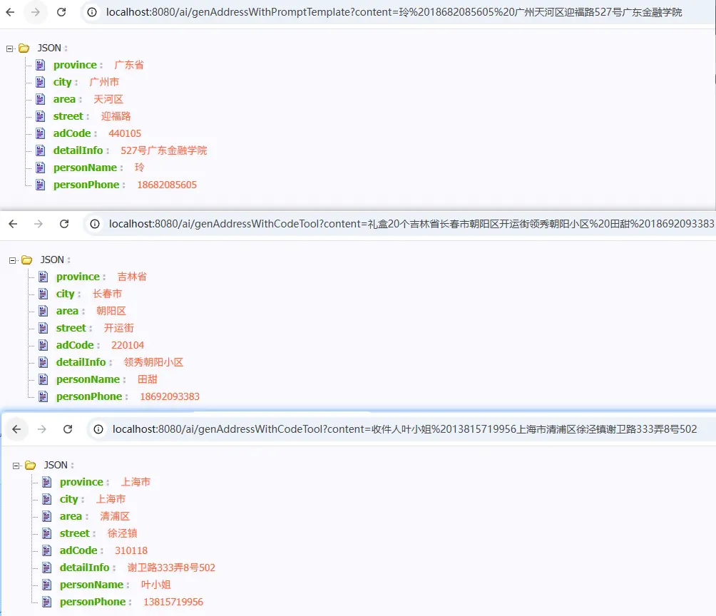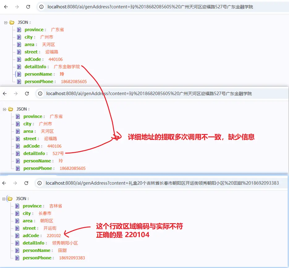 对于省市区这三个相对来说比较固定的地址信息,对于街道门牌号的可能性实在是太多,大模型中有一个参数 temperature 它会控制大模型预测结果的倾向,对此有兴趣的小伙伴可以参照 大模型应用开发系列教程:第二章 模型不是重点,参数才是你真正的控制面板