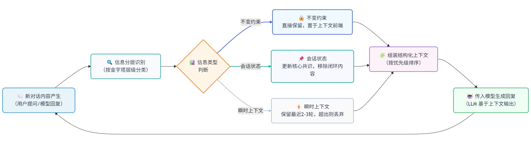 我们需要的不是“一个摘要”,而是“结构化状态”。 —— 即针对不同等级的信息,设计专门的保留和更新策略。