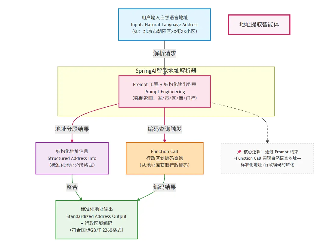 note[📌 核心逻辑:通过 Prompt 约束+Function Call 实现自然语言地址→标准化地址+行政编码的转化]:::noteNode