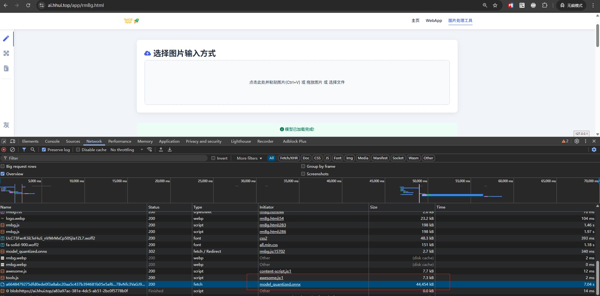 - 模型本地化: 这个网页背后,在首次加载时(或按需),把训练好的抠图模型(onnx)直接下载到了用户的浏览器缓存里。模型大小约40M,百兆网速的小伙伴也就是几秒的加载时间。