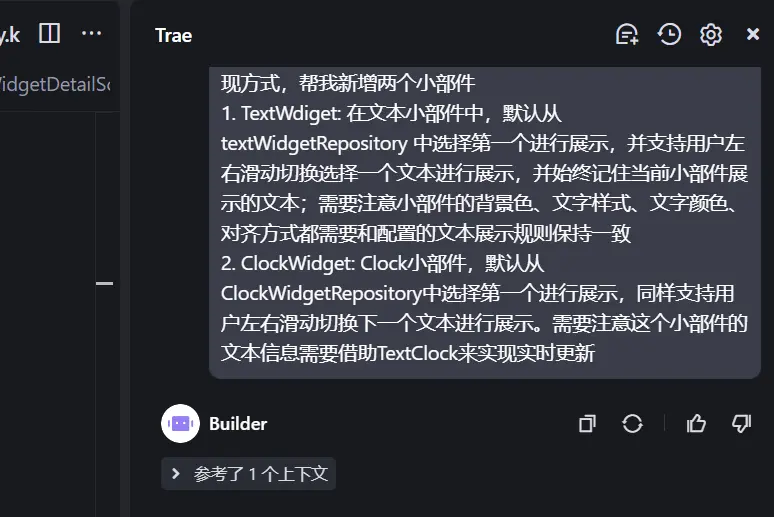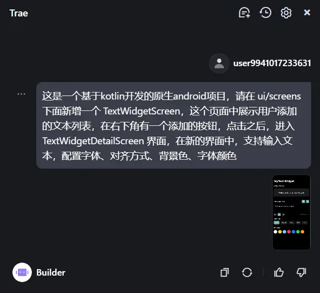 之前使用Trae开发的项目主要是基于web技术栈来搭建的,借助uniapp的生态体系,来生成多端可运行的应用,整体实现链路还是很顺畅的。但是最近准备开发一个android的小部件,需要使用原生的kotlin进行开发,发现直接使用Trae做原生开发,也意外的顺利