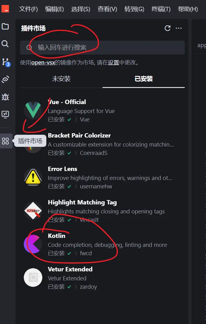 需要注意的时,首次进行kotlin开发时,trae对kotlin语言的支持不够友好,我们需要在插件市场中安装相关插件