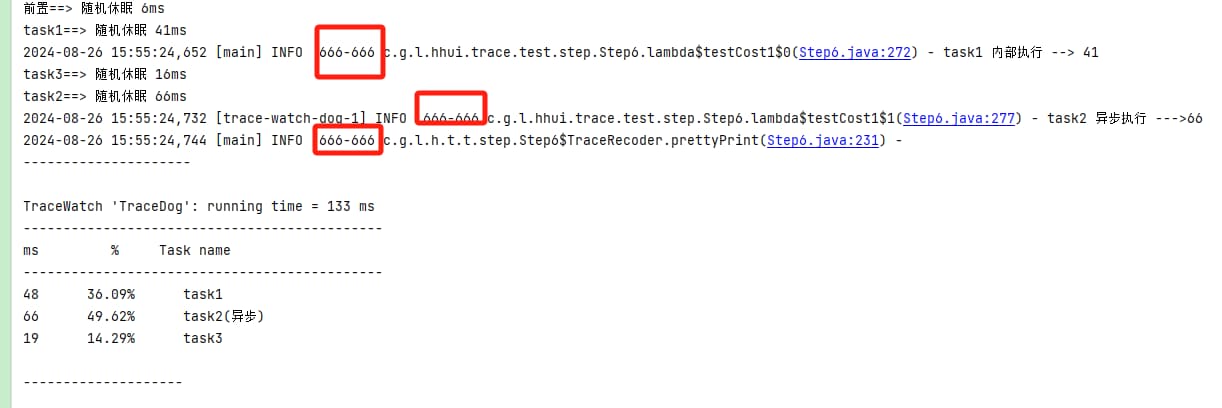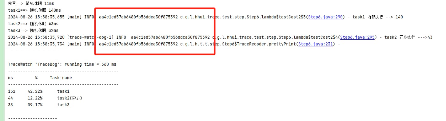 前面封装耗时任务分布工具类的输出,主要是通过System.out.println进行控制台输出,这显然不符合实际的生产使用,接下来我们使用Slf4j进行输出的替换,额外需要注意的就是异步场景下,避免出现全链路的traceId的丢失