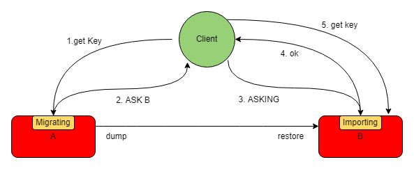 ASK指令:ASK指令主要是在迁移过程中,此时该slot的数据可能一部分位于B,而另一部分key可能还在源节点A上。此时对于读请求而言,源节点A在收到请求后,会先在自己的数据库中查找,如果存在则直接返回结果;如果不存在则说明可能已经迁移至B,则会返回ask错误指令,引导client转向目的地节点查询key;