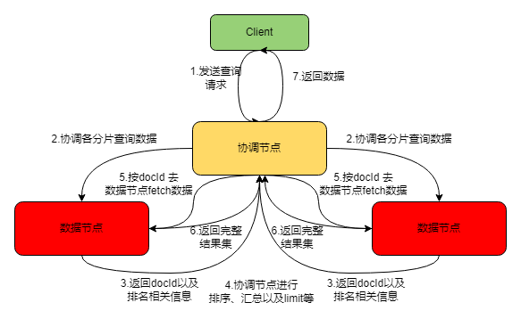 (4)协调节点在收到数据节点返回的结果集后,进行汇总排序取limit等,随着得到需要返回的结果集docId集合;