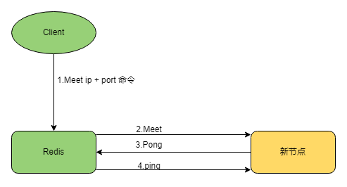 Redis Cluster 加入新节点时,首先需要在客户端需要执行 CLUSTER MEET 命令,命令中需要指定新增节点的地址信息。