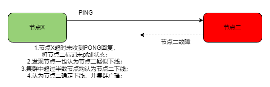 随着时间的推移,经过多轮同步后,对于节点X也超时未收到节点二的PONG,也认为节点二疑似下线,此时节点X发现集群中大部分超过一半的节点都认为它下线时,节点X会把该节点二标记为fail下线状态,并同时在集群中广播该节点fail。所有收到该消息的节点在发现某节点已经被标记为fail状态时,都会更新自己的节点列表将它标记为下线状态,如果该节点是leader副本的节点,则其对应的slave节点在收到下线消息会开始进行选举,进入故障转移流程。