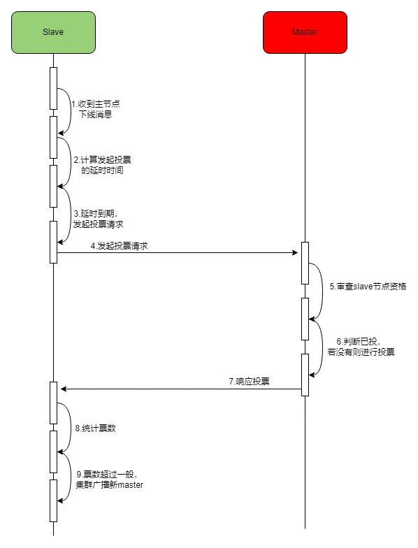 (3)发起投票。slave在延时时间到期后,会向集群广播投票请求;
