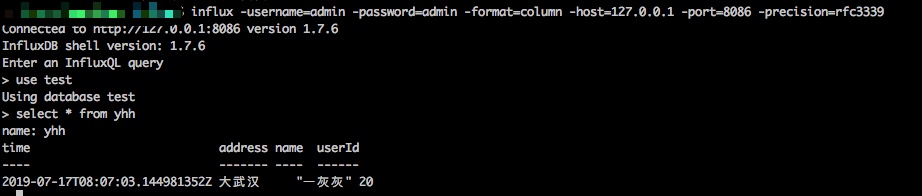 默认情况下,我们直接在控制台输入 influx 之后就可以进入与influxdb交互的终端界面,如果我们修改了influx的默认配置,比如增加了用户名/密码时,这个时候可能需要使用参数来链接到influxdb了