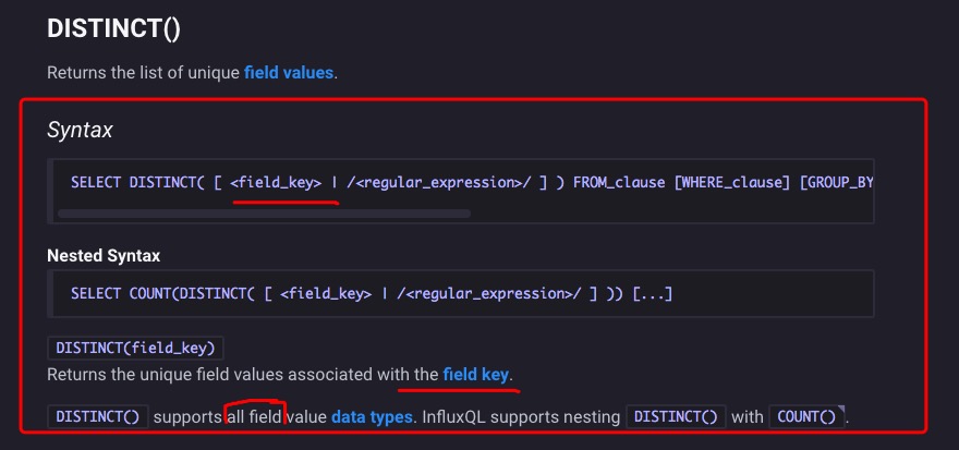 distinct函数主要用于去重,但是请注意函数内的只能是field,不能是tag,官方文档有说明