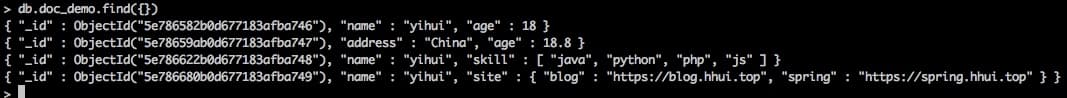 db.doc_demo.insert({'name': 'yihui', 'site': {'blog':'https://blog.hhui.top', 'spring': 'https://spring.hhui.top'}})