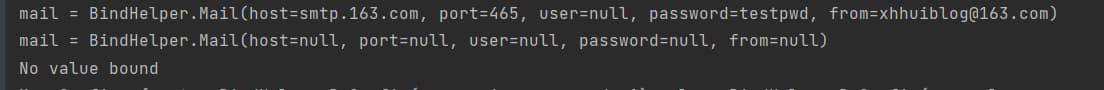 demo.mail.user这个配置不存在时(配置中的是username),此时bind/bindOrCrate 返回的对象中,相关的属性是null (主意这种场景 bind 方法调用不会抛移异常,有兴趣的小伙伴可以实际验证一下)