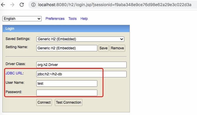 SpringBoot应用的启动入口,上面执行之后,我们就可以通过http://localhost:8080/h2访问h2dabase的控制台,注意下面框处的内容,与前面的配置文件保持一致
