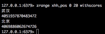 // geoadd xhh_pos 114.31 30.52 武汉 116.46 39.92 北京