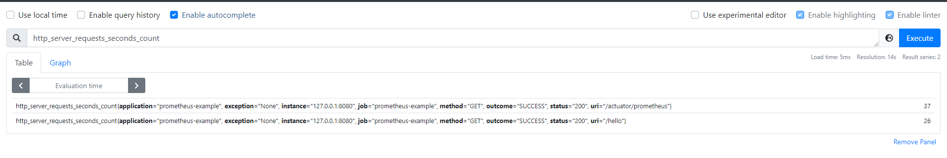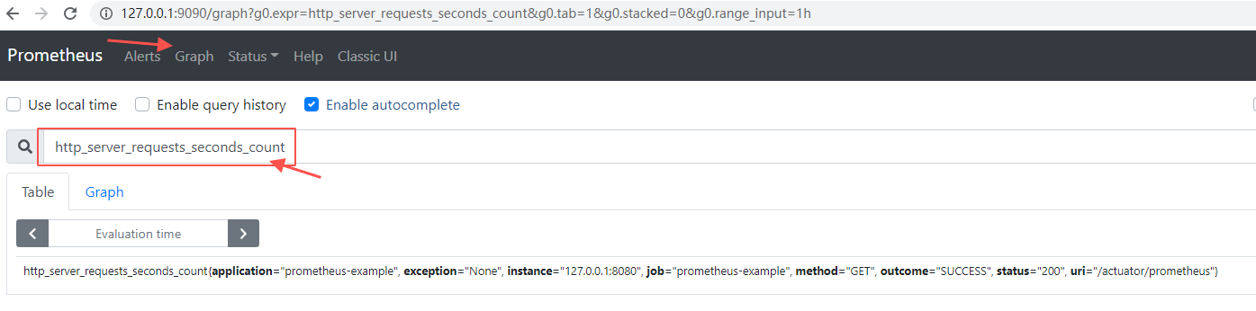 接下来访问Graph,选择metric: http_server_requests_seconds_count 可以看到一条抓起metric的记录