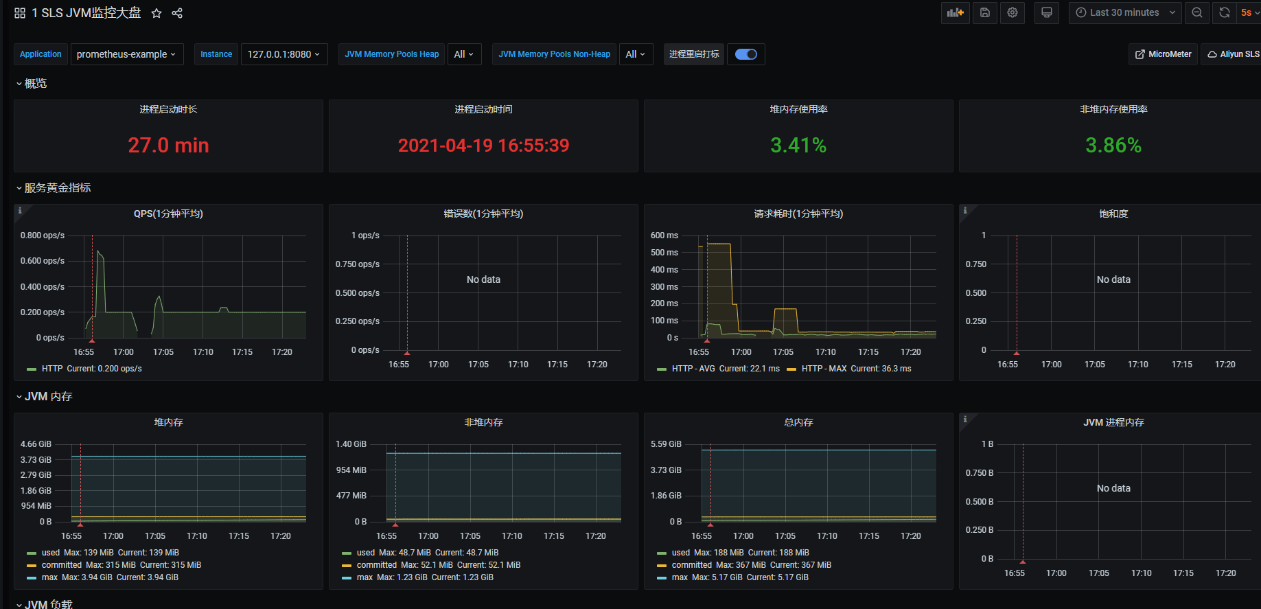 上面整个流程走下来会发现SpringBoot项目接入Prometheus成本很低,基本上没有太多的编码工作,就可以配置给功能集全的监控大盘,简直不要太嗨