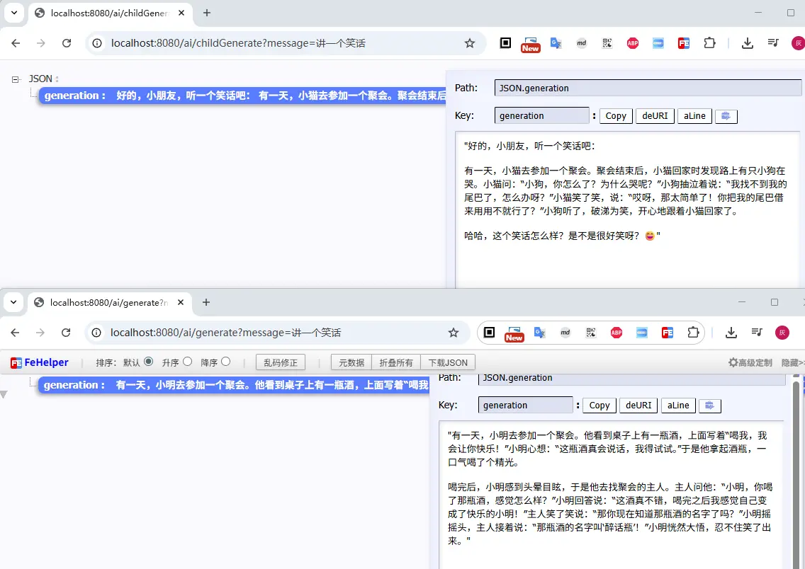接下来我们访问对比一下上面两个接口的返回情况,很明显childGenerate生成的笑话内容更适合3-5岁小朋友
