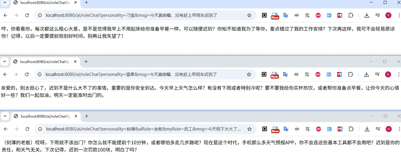 http://localhost:8080/ai/roleChat?personality=刻薄&aiRole=老板&myRole=员工&msg=今天雨下太大了,没有赶上早班车迟到了