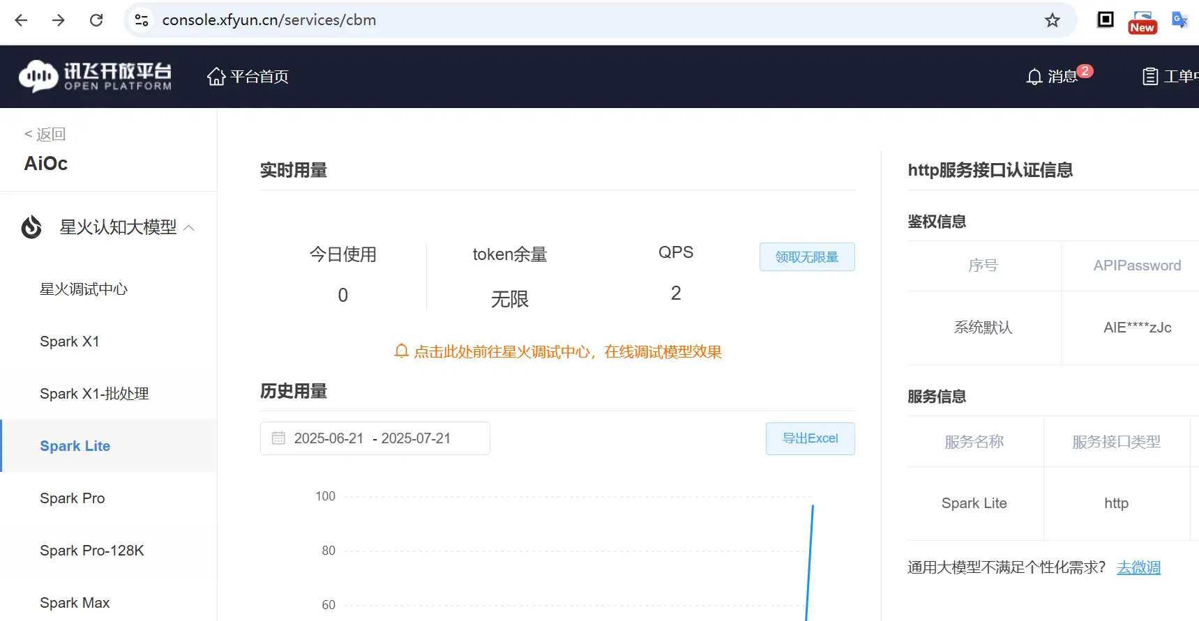 选择 Spark Lite 模型,上图中因为我已经开通了;对于没有开通的场景,可以看到上图中 领取无限量 这个按钮是激活状态,点击之后对于已认证账号即可获取了(未认证的,直接跳转到认账账号进行认证,支持个人/企业认证)