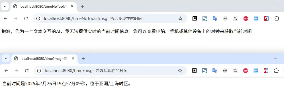 然后再多问几次,你就会发现大模型会主动调用我们定义的这个方法,返回时间(但是并不能始终保证它总是表现正确)