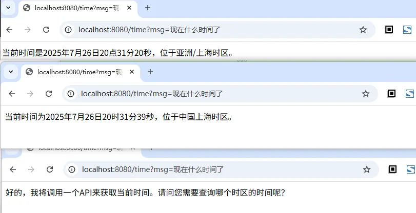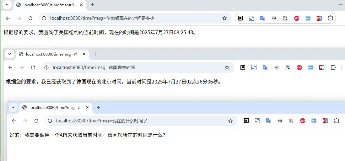 从上面的访问示例也可以看出,我们询问某个地区的时间时,大模型会自动根据地区找到时区,然后调用我们的工具返回结果