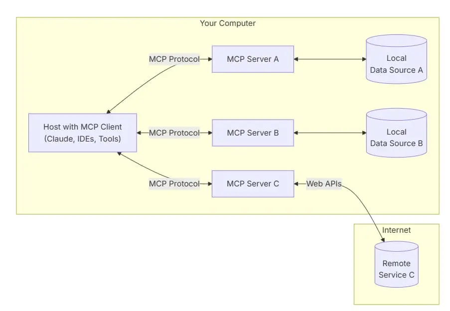 - Local Data Sources: MCPServer所在的计算机上本地的资源信息,如文件、数据库、应用服务等,即MCP通过操作(读取、访问、写入等)这些本地资源来提供特定能力