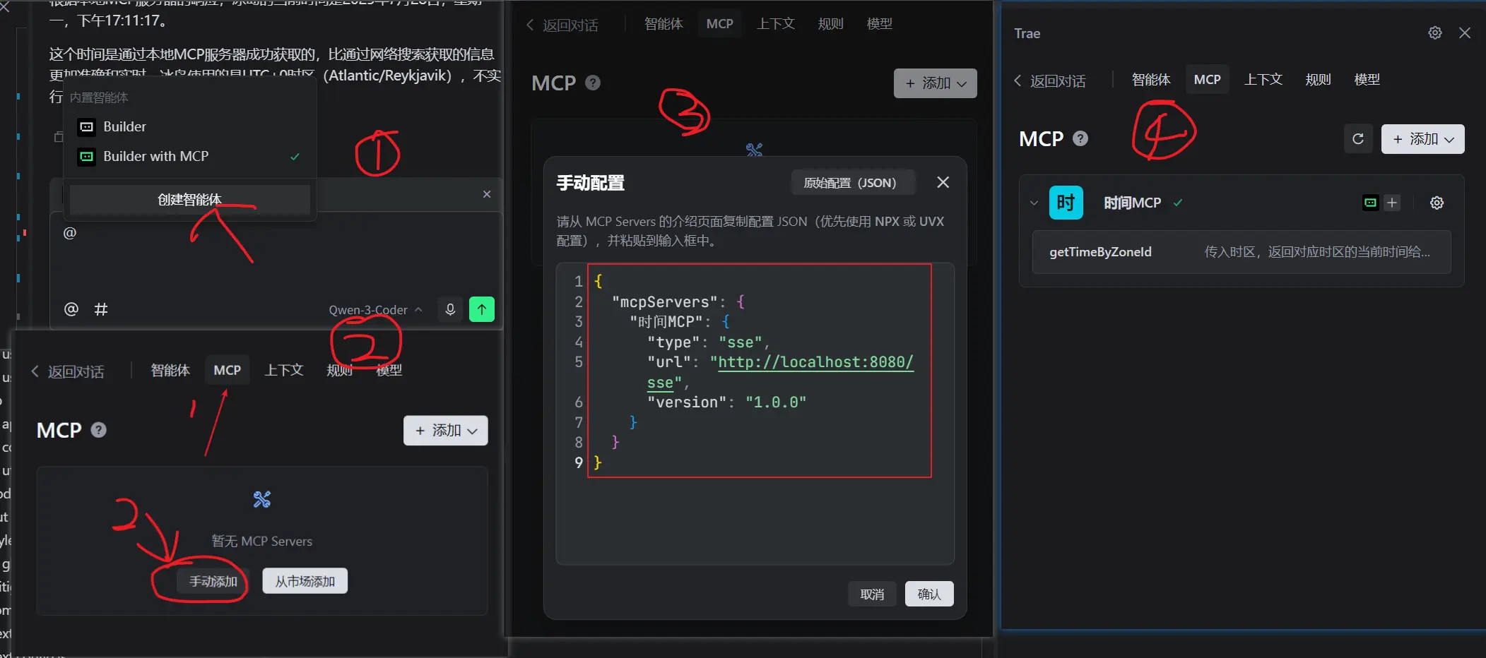 接下来我们使用Trae来连接上面实现的mcp server,并使用mcp server提供的工具