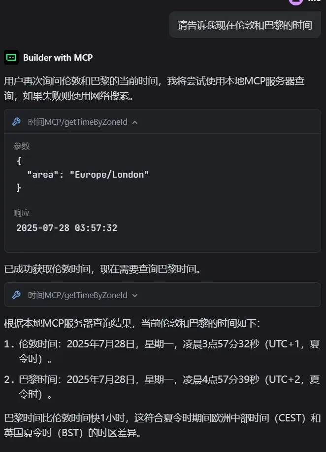 大模型准确的调用了我们刚才创建的MCPServer,分别返回了伦敦和巴黎的时间