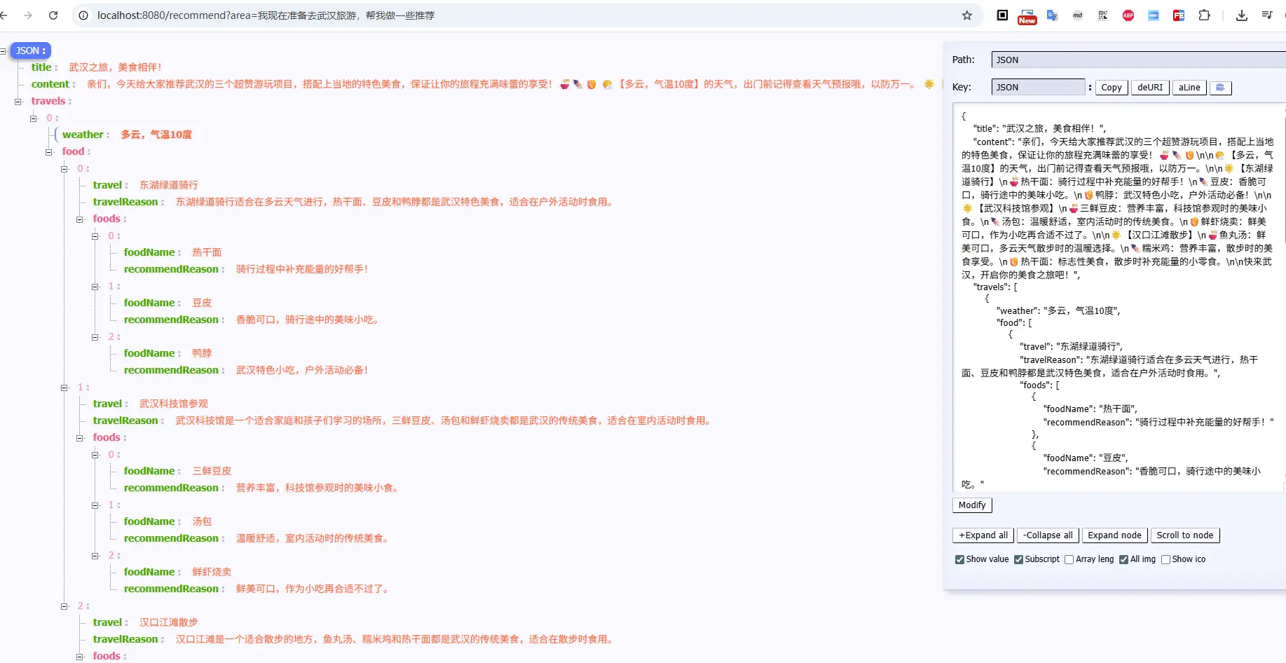 curl 'http://localhost:8080/recommend?area=我现在准备去武汉旅游,帮我做一些推荐'