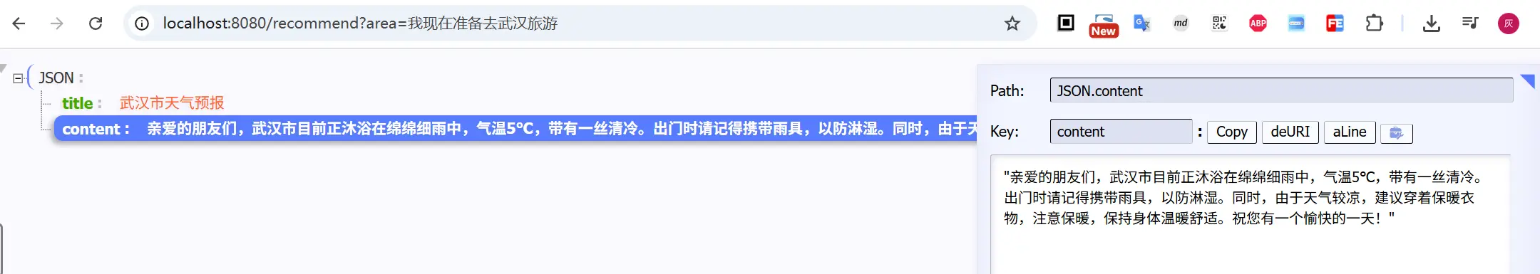 curl 'http://localhost:8080/recommend?area=我现在准备去武汉旅游'