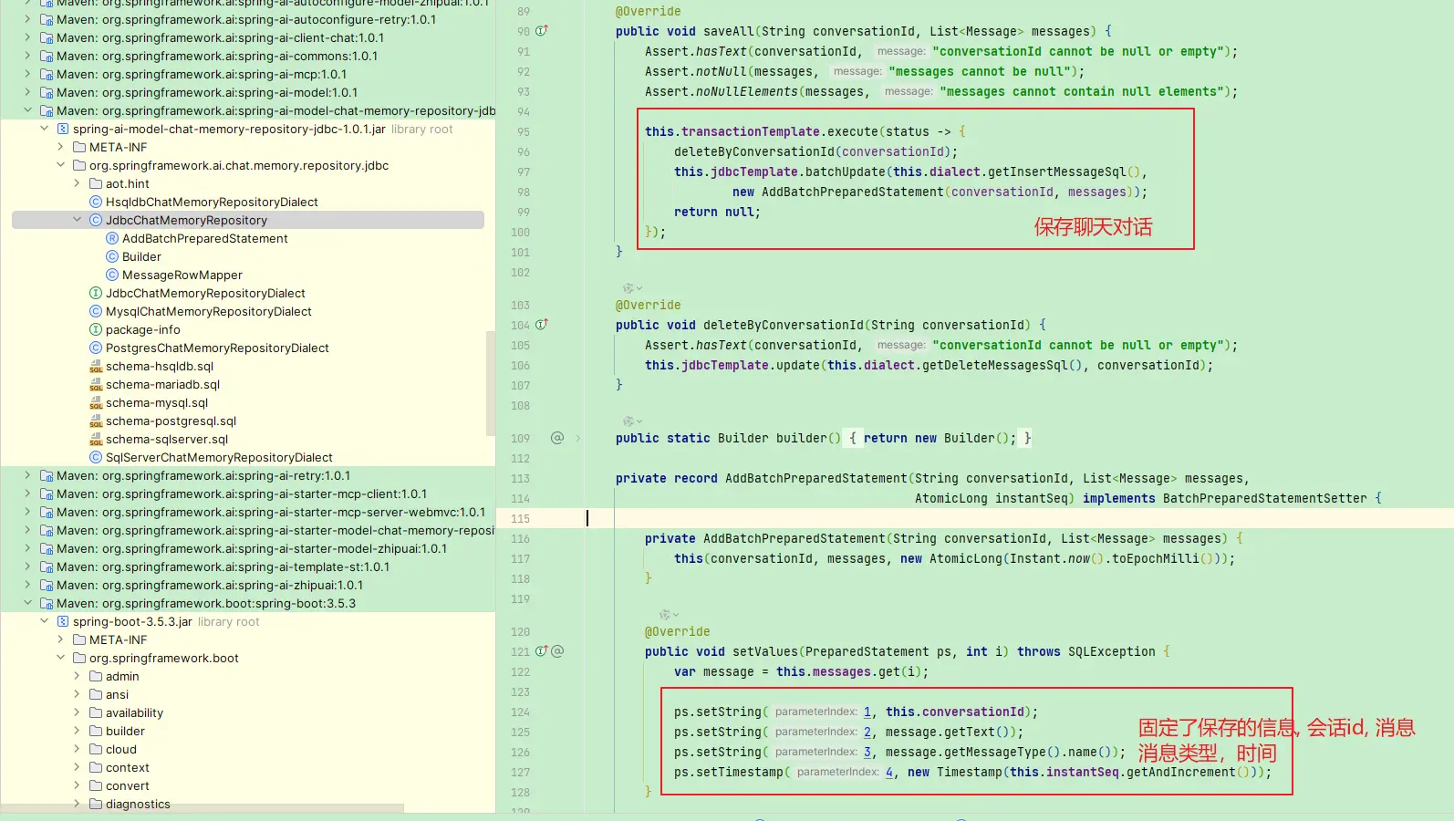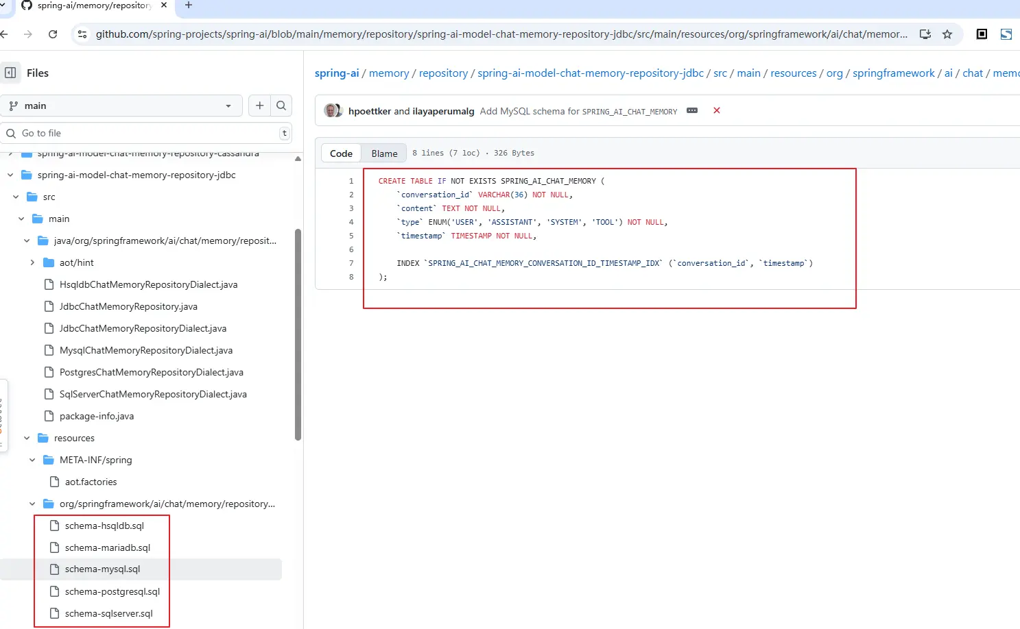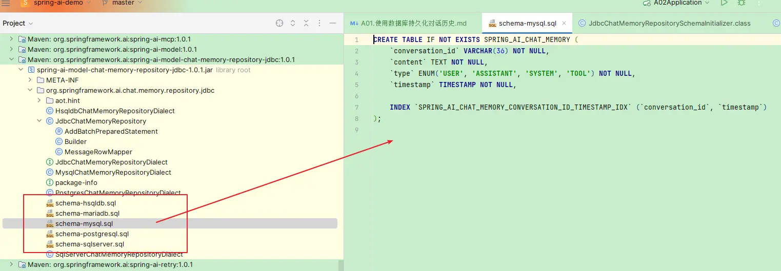 关于这个一点,前面介绍配置的时候也提到了,在spring-aimodel-chat-memory-repository-jdbc的包中,提供了5个schema文件,对应的源码工程结果如下