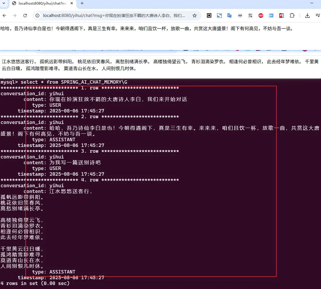 本文介绍的是基于MySql持久化对话历史的实现方案,Spring AI 默认使用 JdbcChatMemoryRepository 来实现,基于 MySql 的表结构,可以满足大部分场景,如果需要自定义表结构,可以通过实现 JdbcChatMemoryRepositoryDialect 接口来自定义