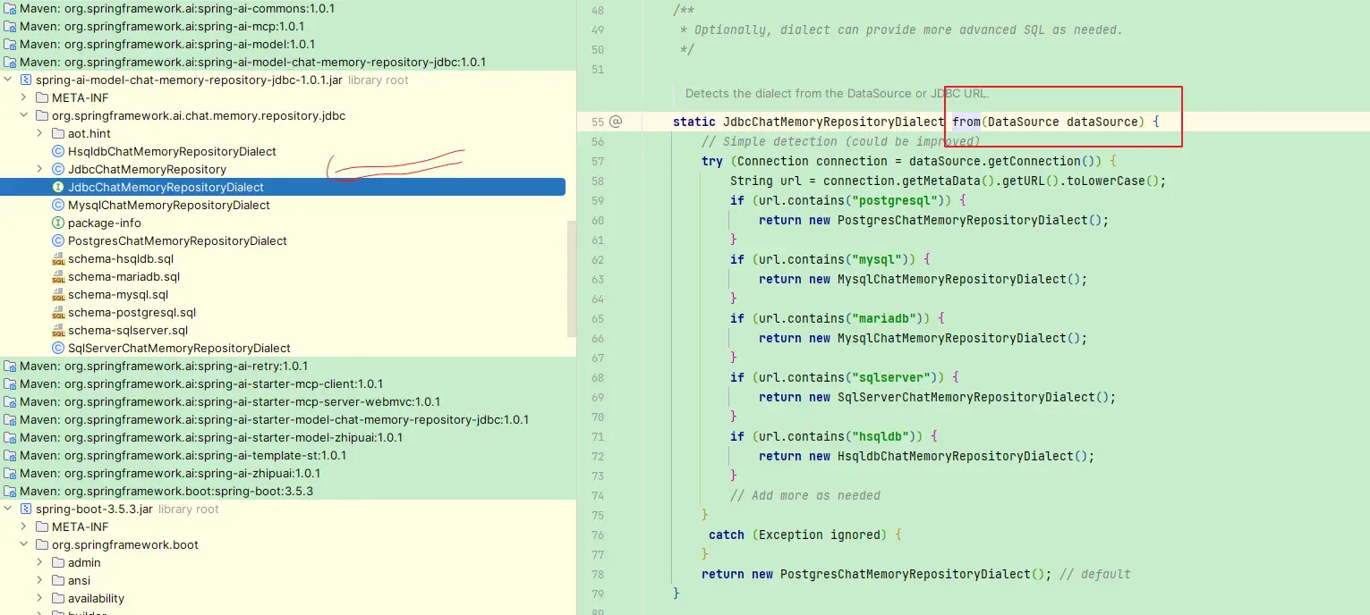 关键实现逻辑 org.springframework.ai.chat.memory.repository.jdbc.JdbcChatMemoryRepositoryDialect.from