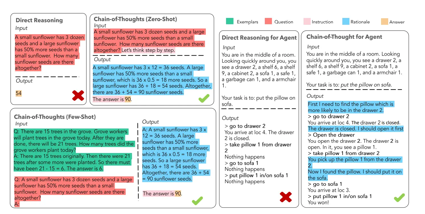 - 提高灵活性:仅仅添加一句“Let's think step by step”,就可以在现有的各种不同的大模型中使用 CoT 方法,同时,CoT 赋予的大模型一步一步思考的能力不仅仅局限于“语言智能”,在科学应用,以及 AI Agent 的构建之中都有用武之地