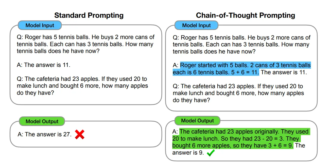 - 例如在算术任务中提供示例:「问题:10 个橘子吃了 3 个,还剩几个?→ 推理:10−3=7 → 答案:7」。模型据此可类推新问题。