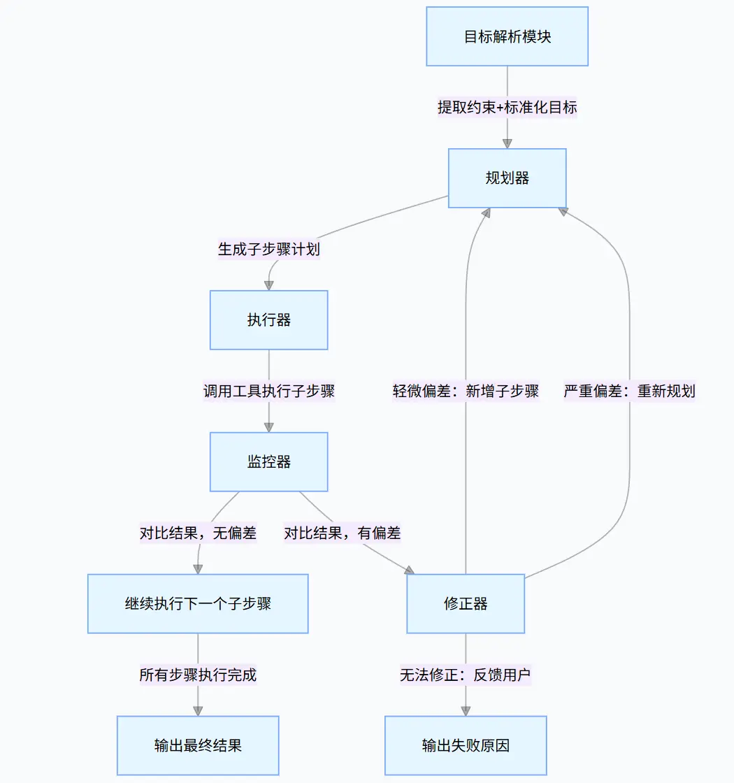 这种结构清晰地展示了规划与执行的分工:Planner 负责构思路线,Executor 负责落实行动。