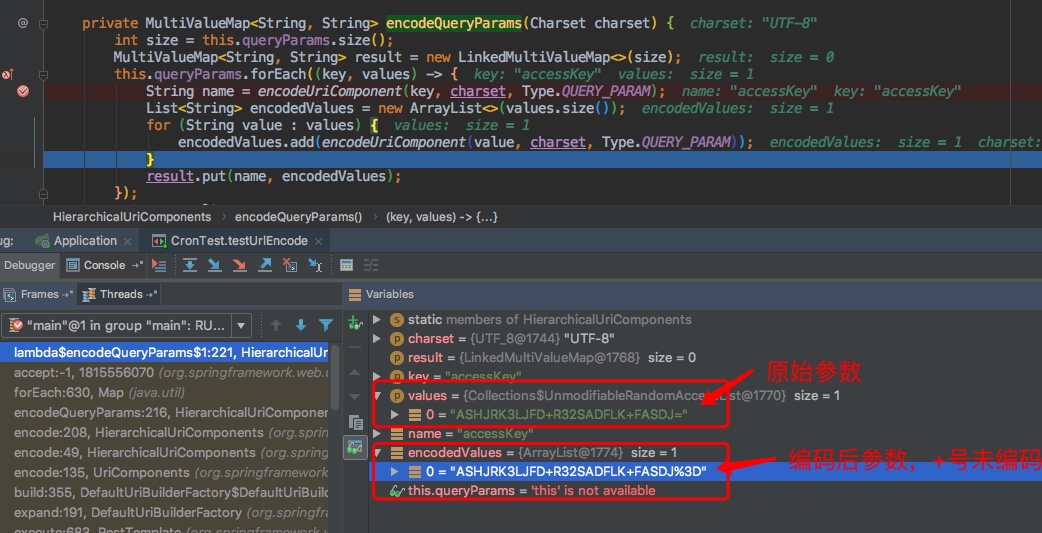 对比下上面的区别,发现这个参数编码,会将请求参数中的 % 编码为 %25, 所以问题就清楚了,我传进来本来就已经是编码之后的了,结果再编码一次,相当于修改了请求参数了