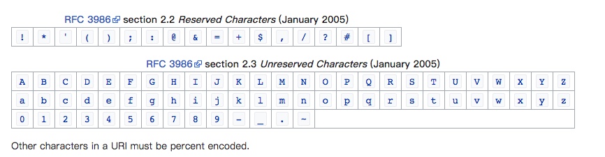 下图是维基百科中关于url参数编码的说明,比如上例中的+号,按照维基百科的需要转码;但是在Spring中却是不需要转码的
