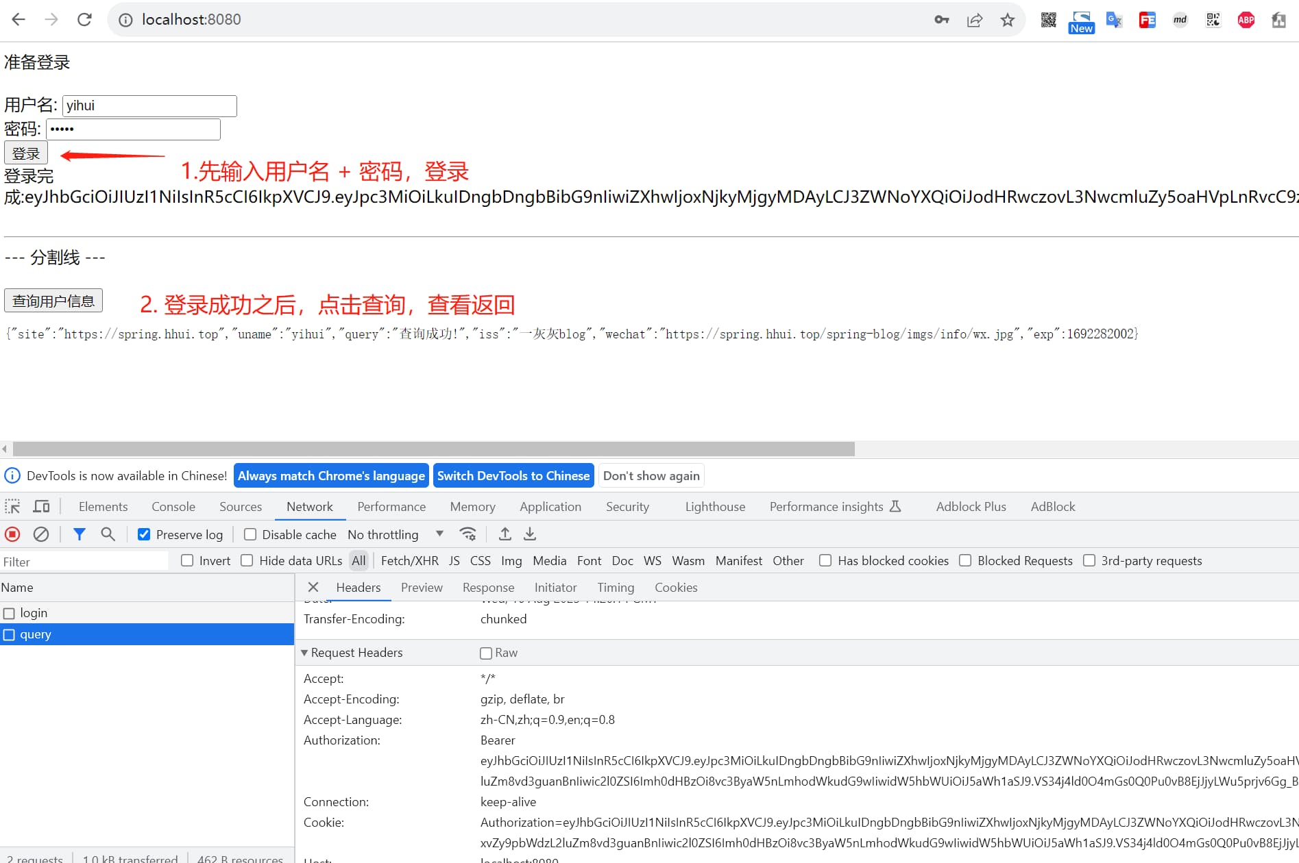 本项目的实际演示中,采用前端存储返回的jwt,然后通过请求头方式来传递jwt