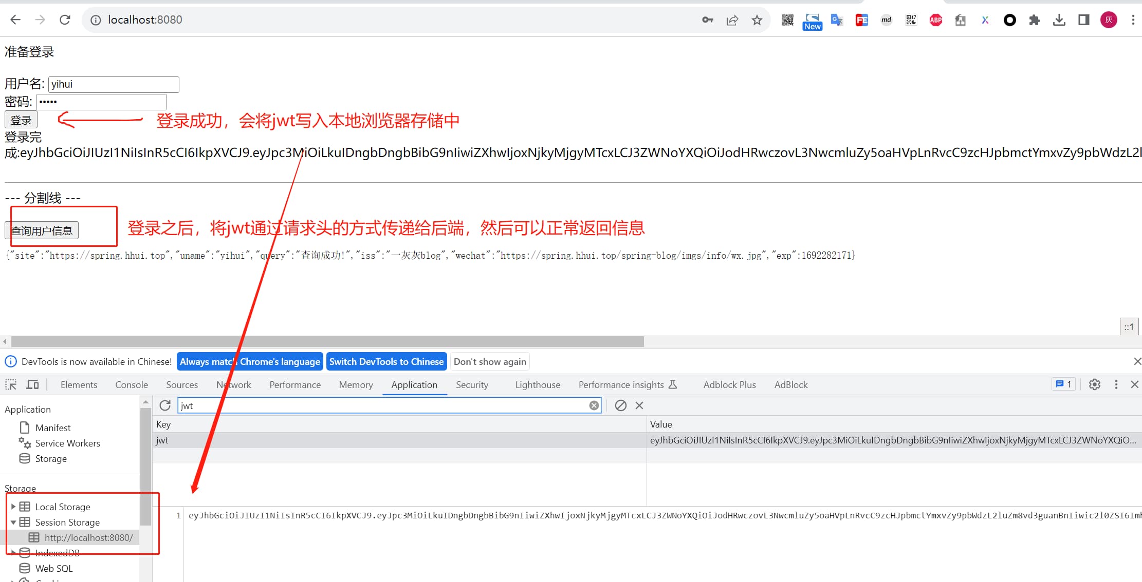 从上面的两张图也可以看出,登录成功之后,jwt写入到本地的session storage中,再后续的请求中,若请求头Authroization中携带了jwt信息,则后端可以进行正常校验