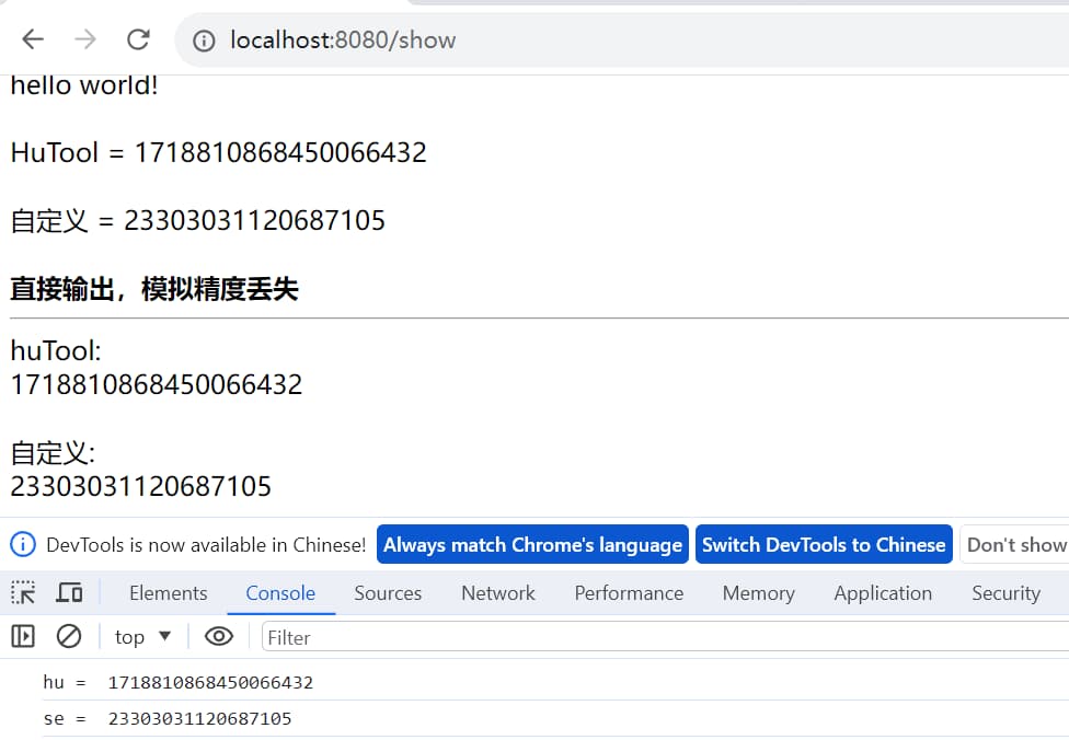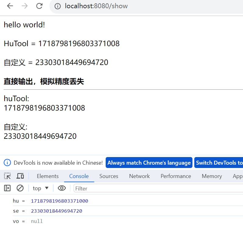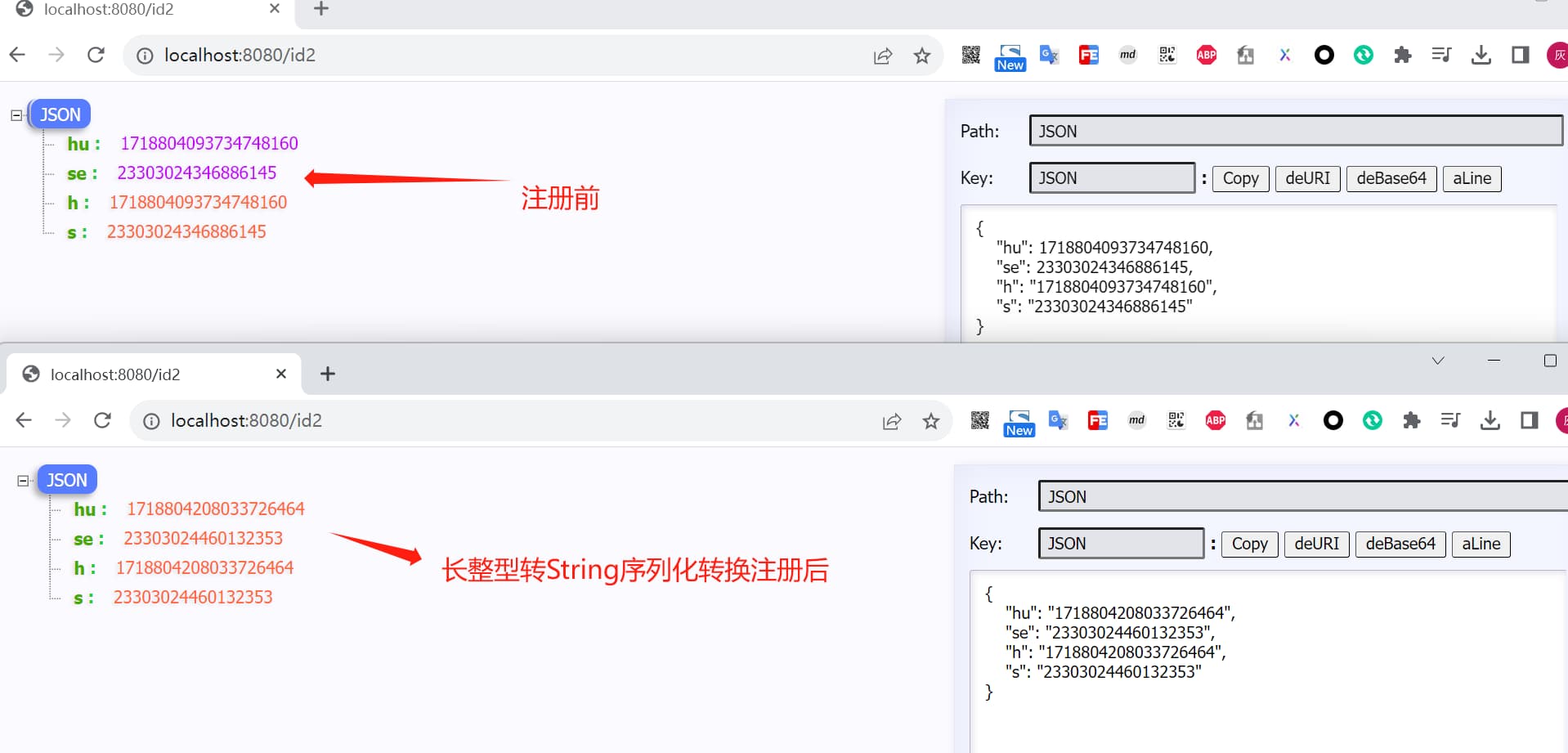 上面配置完毕之后,正常我们再js中获取到的长整型就会变成字符串,不会再出现精度丢失问题了;直接再次验证一下,正常输出应该如下: