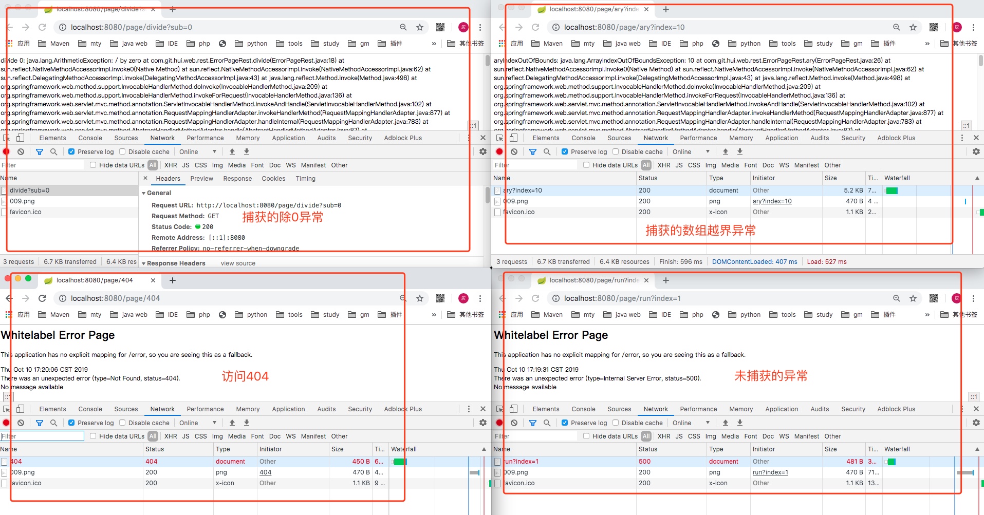 实例测试如下,上面我们声明捕获的两种异常被拦截并输出对应的堆栈信息;