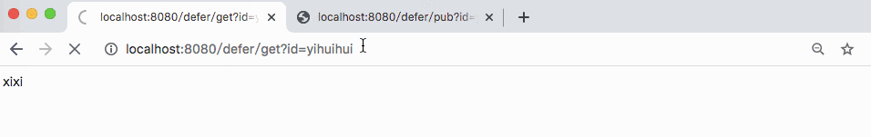 在上面的实例中,用户如果先访问http://localhost:8080/defer/get?id=yihuihui,不会立马有结果,直到用户再次访问http://localhost:8080/defer/pub?id=yihuihui&content=哈哈时,前面的请求才会有结果返回