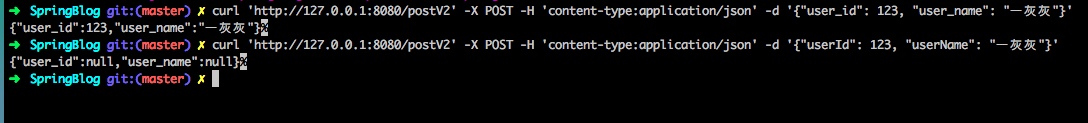 * curl 'http://127.0.0.1:8080/postV2' -X POST -H 'content-type:application/json' -d '{"user_id": 123, "user_name": "一灰灰"}'