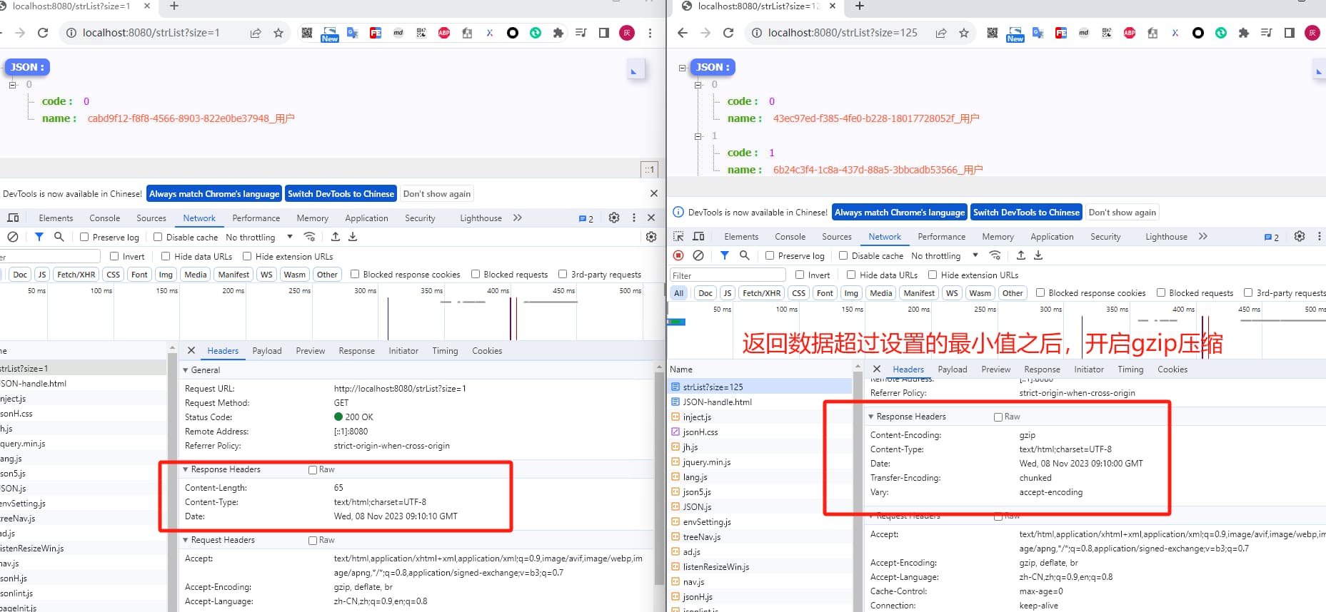 下图为实际访问对比,从两次请求的返回头来看,左边的示例表示没有开启压缩处理,而右边的示例则开启了gzip压缩。