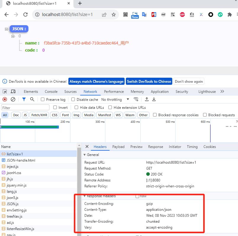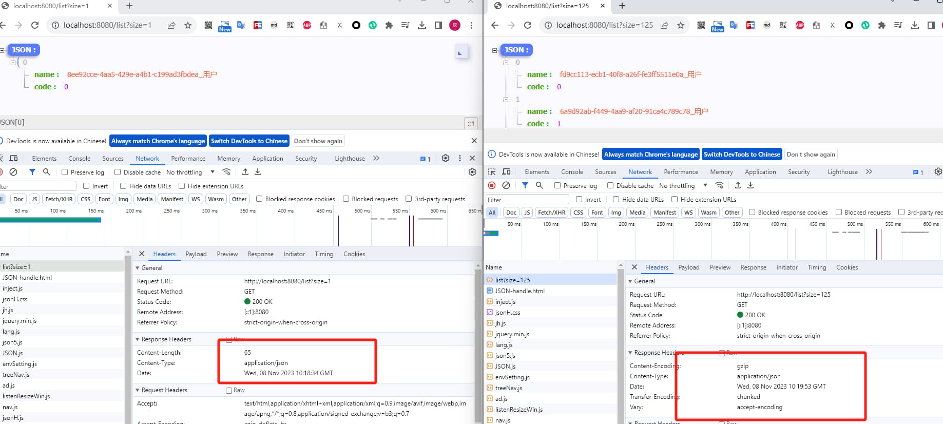 根据上述实际表现,我们注意到一个令人费解的现象:同样返回一条数据时,如前面返回String时,不需要进行压缩;然而,当数据类型为JsonObject时,即使返回的内容小于128字节,也会启用gzip压缩。