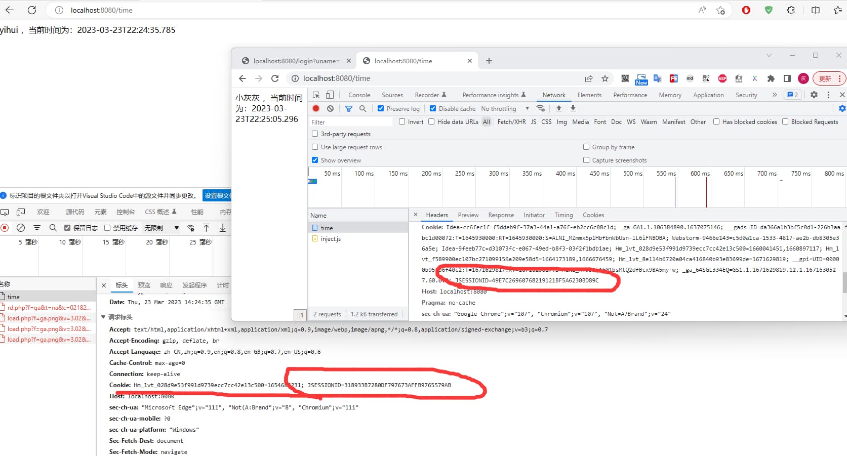 session:再浏览器窗口打开期间,这个会话一直有效,即先访问login,然后再访问time,可以直接拿到name, 若再此过程中,再次访问了login更新了name,那么访问time获取到的也是新的name