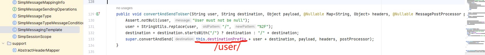 虽然上面提供了两种方式,但是看一下convertAndSendToUser的源码实现会发现,它的底层依然调用的是convertAndSend,向特定用户发送消息,无非就是调整 destination 的取值