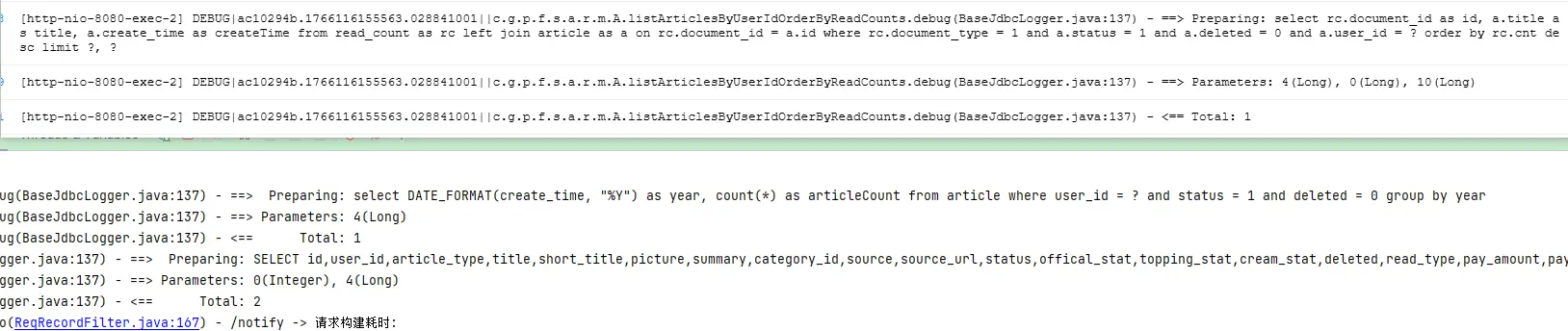 相信各位javaer都会有类似的经历:面对控制台中输出的MyBatis日志,看到类似"Preparing: SELECT * FROM user WHERE id = ? AND status = ?"和"Parameters: 123(Long), active(String)"这样的信息,却需要手动将参数值代入SQL模板中,才能知道这条SQL实际执行的是什么?这个过程不仅繁琐,而且容易出错,尤其是在处理复杂查询时。