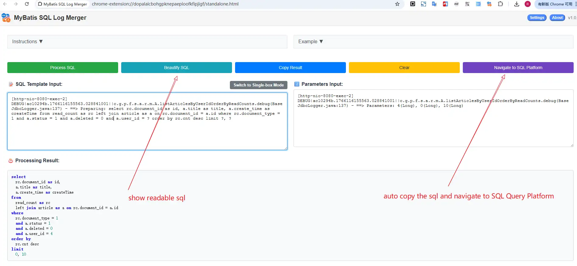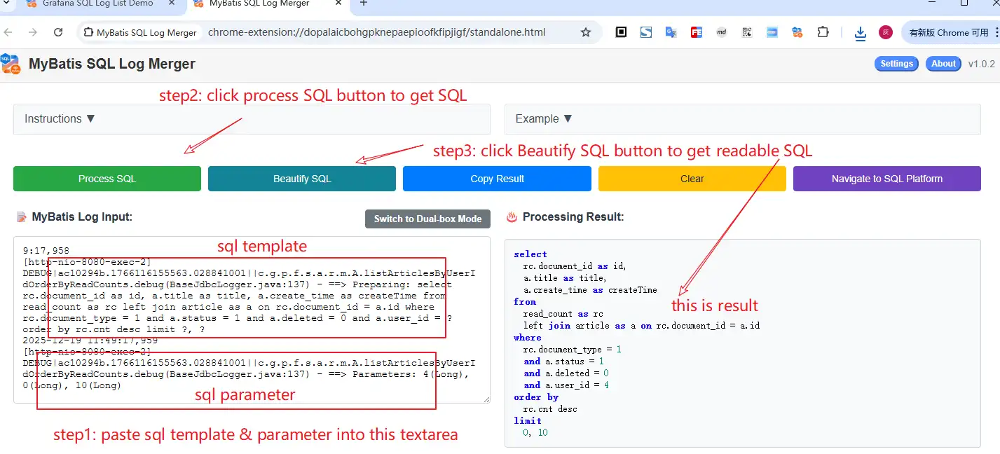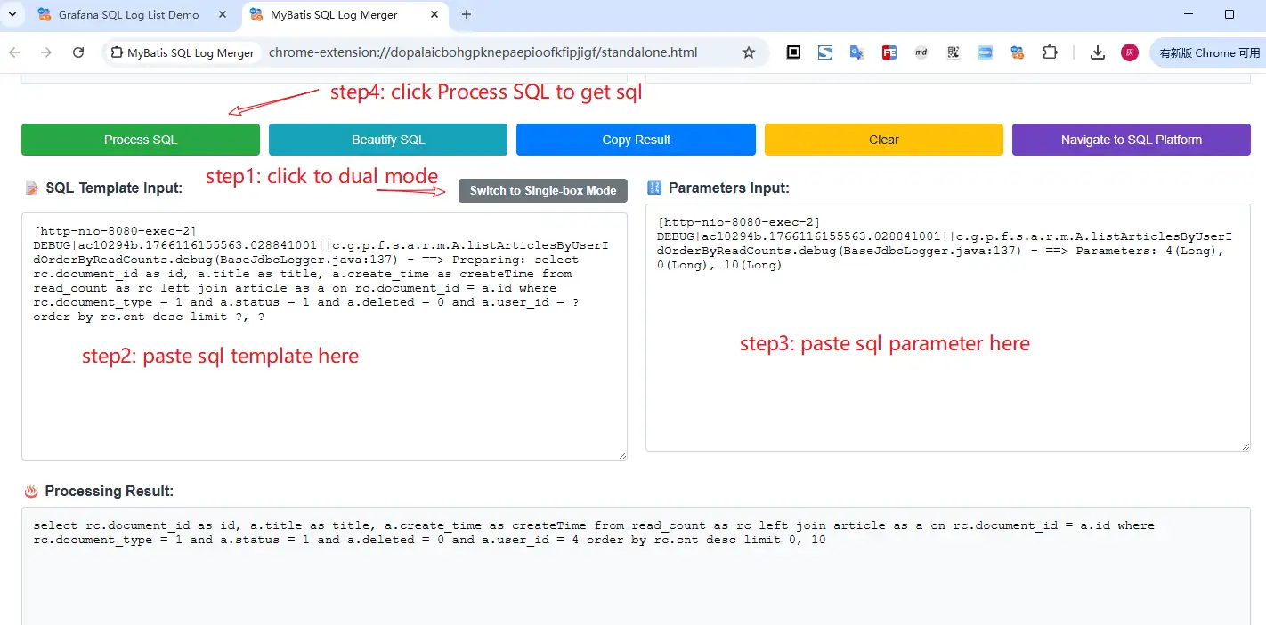 - 粘贴处理:打开插件界面,粘贴日志内容,点击"Process SQL/处理SQL"